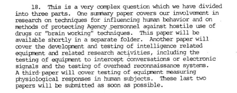 One bullet, in particular, deals with the CIA’s “involvement in research on techniques for influencing human behavior and on methods of protecting Agency personnel against hostile use of drugs or “brain working” techniques.”