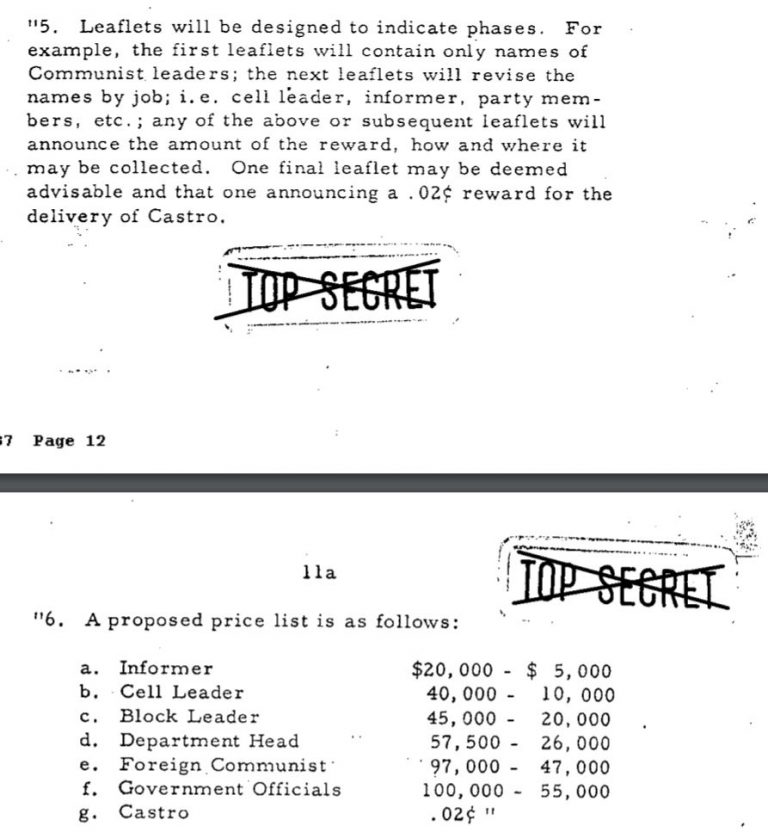 “Leaflets will be designed to indicate phases. For example, the first leaflets will contain only names of communist leaders; the next leaflets will revise the names by job; i.e. cell leader, informer, party members, etc.; any of the above or subsequent leaflets will announce the amount of the reward, how and where it may be collected. One final leaflet may be deemed advisable and that one announcing a .02c reward for the delivery of Castro.”