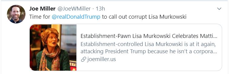 By News Editor. Maybe it was coincidence, maybe not. But shortly after Joe Miller called on President Trump “to call out corrupt Lisa Murkowski,” he did: