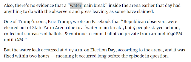 Exhibit 5,003,406: The “Factcheck” article — which attempted to debunk overwhelming evidence of Georgia election fraud — asserted that there was never any water main break in State Farm Arena, where absentee ballots were tallied, and that counting never stopped.