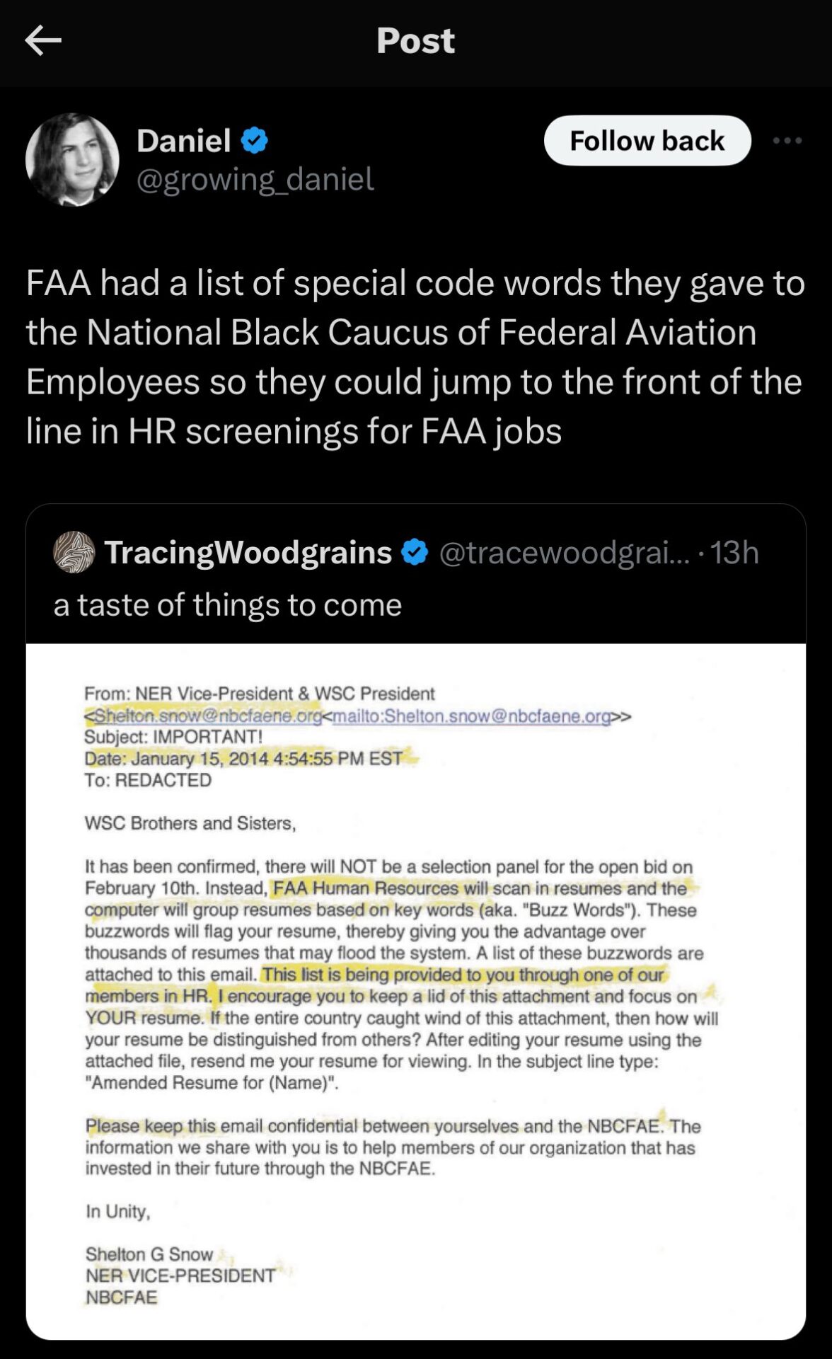 First, the FAA gave secret code words to students in the Black Caucus of Federal Aviation Employees to put in their resume that would skip them to the front of the line.