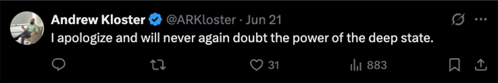 Within a half-hour of President Trump announcing successful US airstrikes on Iranian nuclear facilities Saturday night, Kloster wrote on X, “I apologize and will never again doubt the power of the deep state.”
