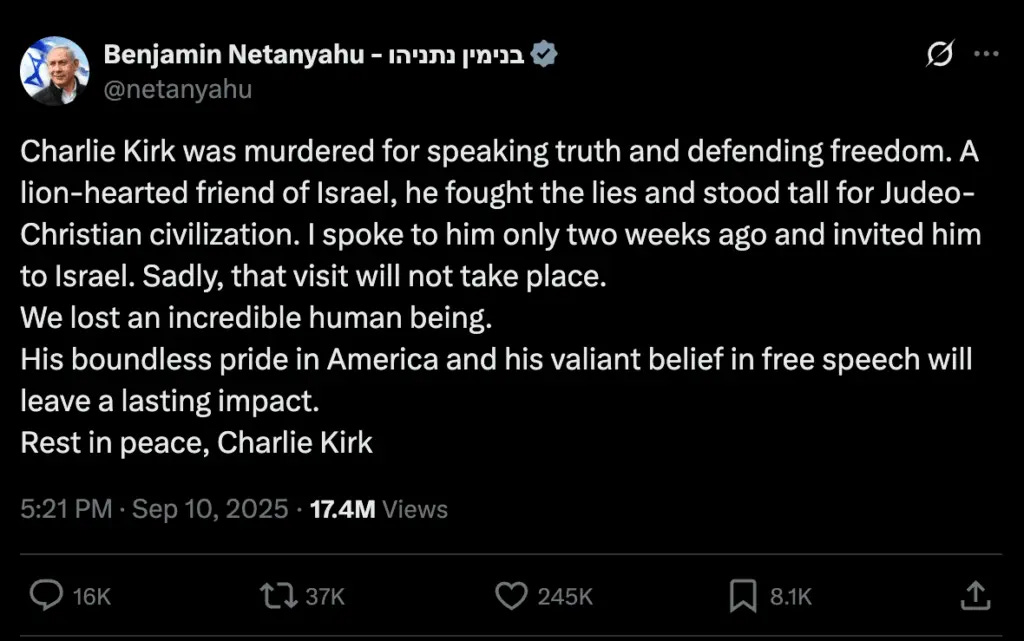 – Kirk had turned down the Prime Minister’s invitation to visit Israel two weeks before his murder—a detail Netanyahu declined to mention in his tweet or since.