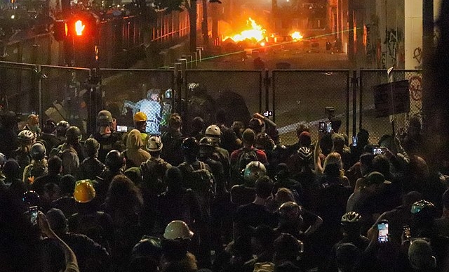 Update: Damage to Portland Art Museum, flare thrown into building. Protesters now marching through streets. Riot declared. #PDXprotests #pdxriot #PortlandProtests #portlandriot #portland #protest #riot pic.twitter.com/DPHBt1ncrK